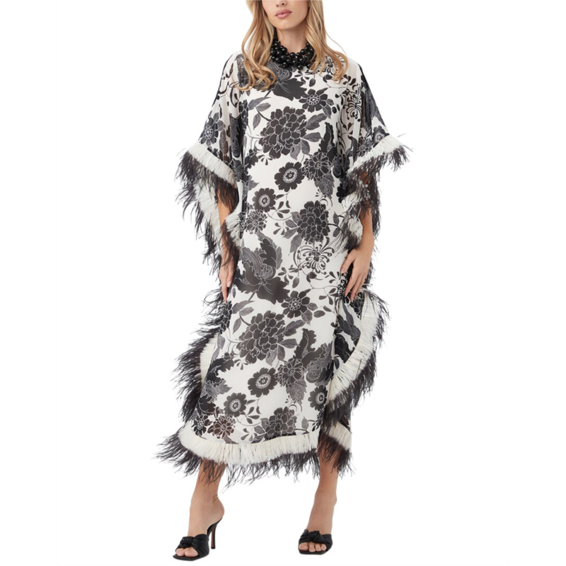 Introducing the Trina Turk Neena Caftan, a stunning addition to your wardrobe from the highly acclaimed brand, Trina Turk. This stylish caftan features a black and white design with a boatneck, short dolman sleeves, and matching feather trim along the sleeves and hem for a touch of elegance. With a maxi length of approximately 49 inches from shoulder to hem, this caftan offers a chic and comfortable fit. Made from 100% recycled polyester, the Neena Caftan is not only fashionable but also environmentally conscious. Easy to slip on and featuring a dry clean only care instructions, this imported caftan is perfect for any special occasion or casual outing. Add a pop of contemporary and colorful style to your wardrobe with the Trina Turk Neena Caftan.