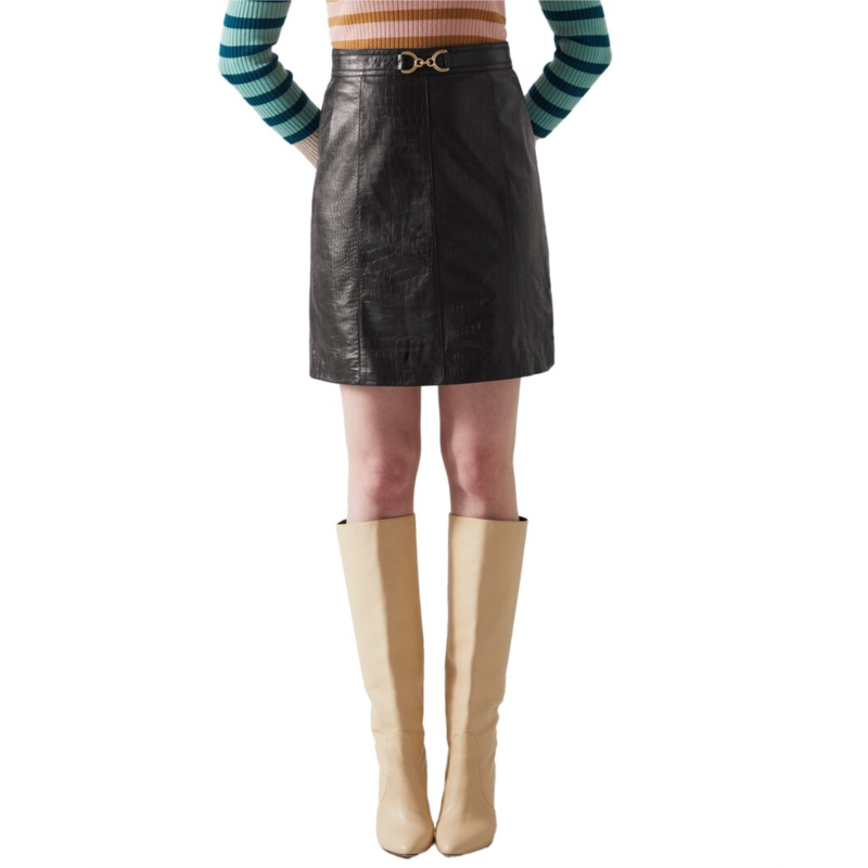 Introducing the LK Bennett Leather Aubree Skirt, a must-have addition to any stylish womans wardrobe. Crafted from 100% luxurious lambs leather and featuring a sleek black color, this skirt is perfect for adding a touch of edge to your outfit. The skirt measures approximately 20 inches from waist to hem and has a convenient back zipper for easy wear. Made with 100% viscose/rayon lining, this skirt is designed for both style and comfort. For best care, it is recommended to have this skirt dry cleaned by a specialist. Imported from high-quality materials, this LK Bennett Leather Aubree Skirt is a timeless piece that can be dressed up or down for any occasion.