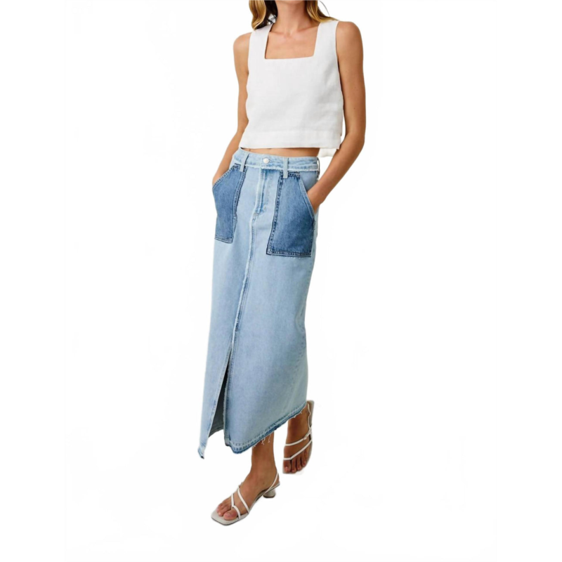 Who doesn''t love a good maxi skirt?Meet the Women''s Calabasas Skirt by Rails, a standout piece in a textured Tattered hue, crafted for streetwear aficionados. This high-rise maxi skirt is made from a sustainable blend of 80% cotton and 20% post-consumer recycled cotton, featuring a zip closure and stylish contrast patch pockets. It boasts a stiff silhouette with raw edges and a release hem, accentuated by a chic front slit. Perfect for spring vacation settings, it combines eco-friendliness with effortless style.