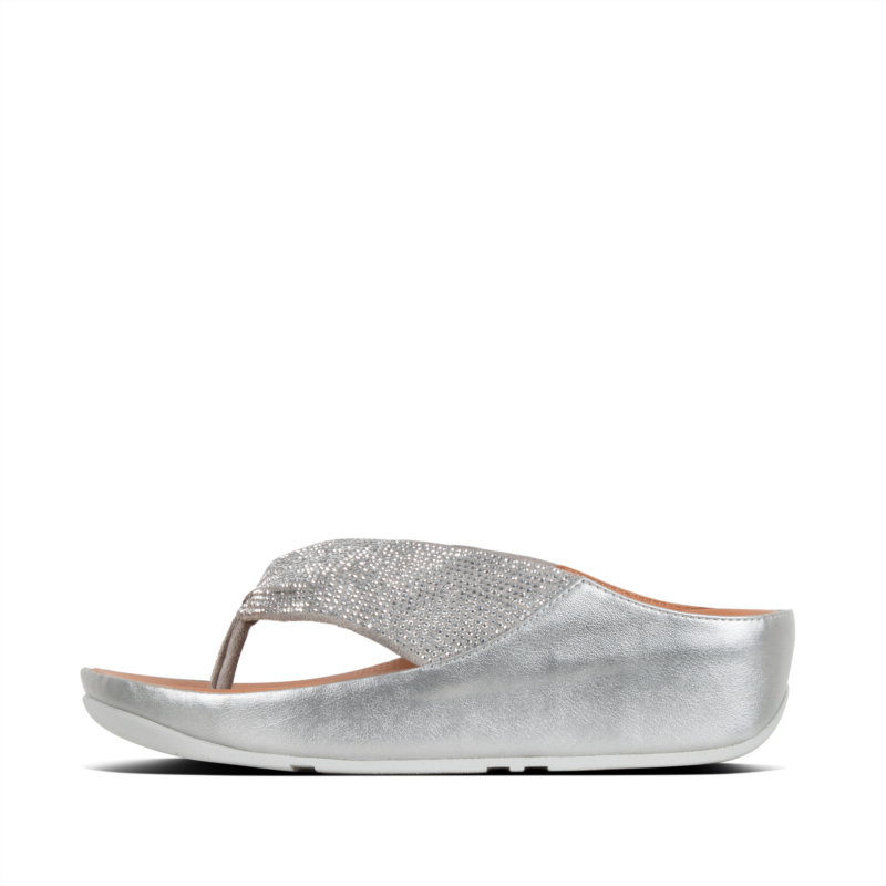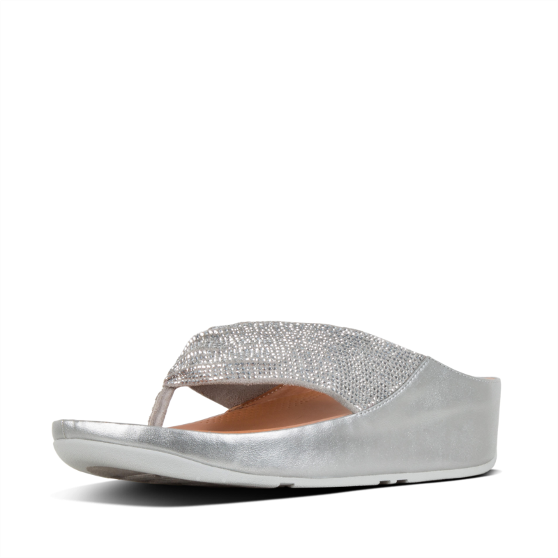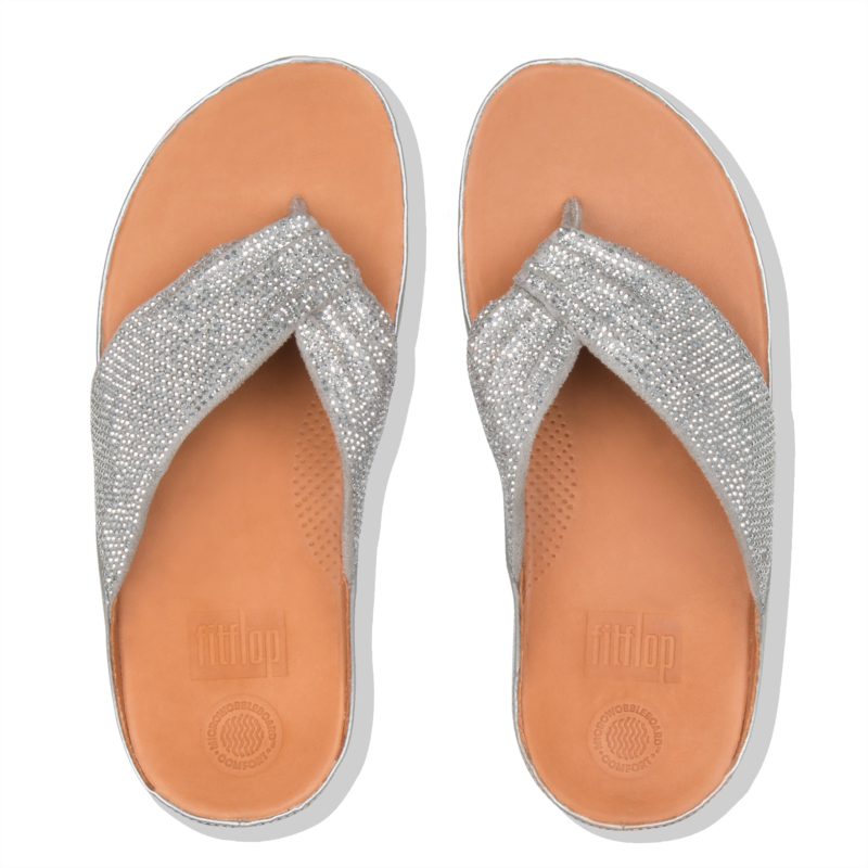 These are toe-thongs with a twist ? literally. Here in shimmering crystal-smothered fabric that ''twists'' at the toe-post to form soft, draped, fluid lines, these glittering sandals will look equally good on a cafe terrace, beach or dance floor. And featuring our legendary all-day comfortable Microwobbleboard midsoles, they''re as easy on the feet as they are on the eye.