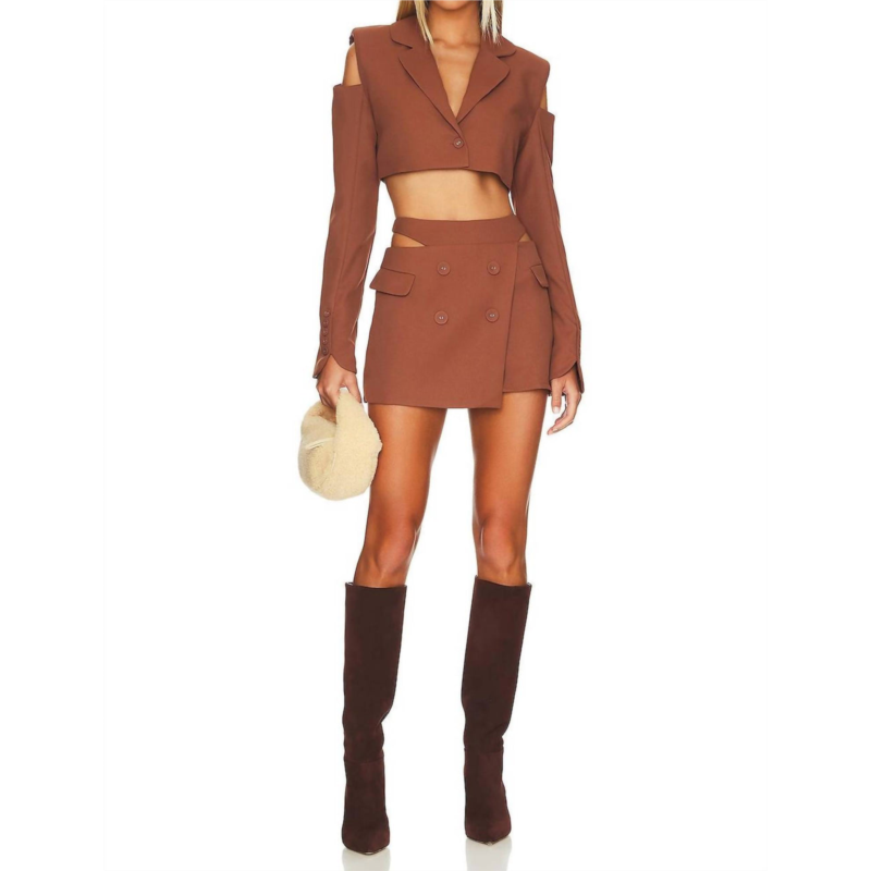 The perfect mini skirt does exist.Elevate your evening events with the Alysa Mini Skirt by For Love & Lemons, crafted in an elegant brown hue. This monochrome piece features suiting fabric with a hip cut-out design and a draped fabric overlay for a striking look. Composed of 100% recycled polyester with a lining of 53% ecovero and 47% rayon, it incorporates faux front button accents and side slant flap pockets. Closure - Zip closure. Care - Machine wash. The built-in skort shorts add practicality to this fashionable ensemble, perfect for spring occasions.
