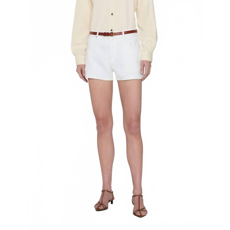 Not only cute but extremely comfortable. The jean shorts you will be reaching for all season long.The Hang Short by FRAME is the perfect minimalist addition to your summer wardrobe in crisp white. These women''s jean shorts are crafted from 100% cotton, featuring a mid-rise waist and mini hem with a 3-inch inseam for a flattering and comfortable fit. Made in the USA, they come with functional pockets and a secure button closure. Care is easy with machine wash instructions, making them an ideal choice for vacations and warm weather styling.