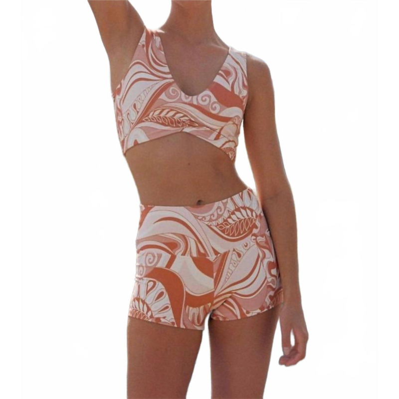 Bike shorts you dont even need a bike for! We are here for the bike short trend.Elevate your athleisure collection with the Montce Micro Bike Short in Carmel, the ultimate versatile piece for women. Crafted from a Nylon Blend consisting of 90% Nylon and 10% Spandex, these shorts offer a light compression fit with a wide, contouring waistband and approximately a 2” inseam. Ideal for loungewear, light exercise, or streetwear, these cheeky boy shorts feature flat locked seams for extra comfort and can double as swim bottoms. Designed with a pull-on closure for easy wear and a stylish patterned design, this trend-forward piece is perfect for your spring workout wardrobe. For care, simply hand wash as required.