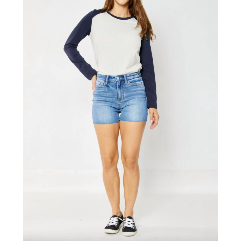Not only cute but extremely comfortable. The jean shorts you will be reaching for all season long.Enhance your summer wardrobe with the Judy Blue Raw Hem Jean Shorts in a stylish medium wash. Crafted from 93% Cotton, 5% Polyester, and 2% Spandex, these denim shorts offer a comfortable pull-on closure for easy wear. The shorts feature a rise of 10.5 inches and an inseam of 5 inches, complete with functional pockets for added convenience. Care is simple with machine wash and tumble dry, perfect for carefree summer outings.