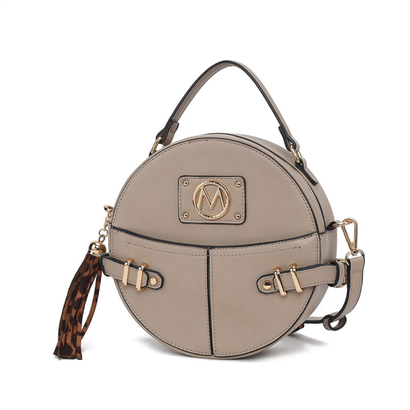 This stylish round structured crossbody bag is crafted from high-quality vegan leather, offering a sophisticated and durable design. It features a convenient top handle for easy carrying and a detachable, adjustable double-sided wide shoulder strap, offering both comfort and style. The strap’s double-sided feature adds a unique touch, giving the bag an elevated, chic look.