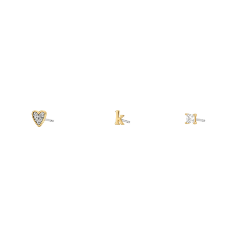 Spell out your personal style with this sparkling earring set. Featuring three petite single studs ? an initial, glitter heart, and square cut cubic zirconia ? cast in brass with shimmering accents. The playful blend of gold and silver tones offers endless versatility, effortlessly elevating any look with this charming trio.