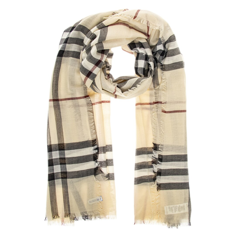 Elevate your winter wardrobe with the Burberry Check Wool Scarf. Crafted from 100% wool, this luxurious scarf features the iconic Burberry Check pattern in a versatile stone color. The lightweight feel and eyelash fringe edges add a touch of sophistication to any outfit. Measuring 78.7 inches by 35.4 inches, this scarf is perfect for layering or draping over your shoulders. Made in Italy, this piece is a timeless accessory that exudes British influence. Add a touch of luxury to your look with this Burberry scarf.