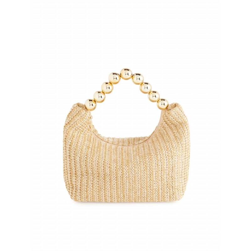 Dont be mistaken by its size, this little bag holds more than youd expect!Add a dash of sophistication to your wardrobe with the Alys Top Handle Bag. Featuring a chic woven design, this beauty is elevated by its statement-making handle adorned with gleaming oversized pearls or metallic gold spheres. Compact yet versatile, the Alys effortlessly transitions from daytime glam to evening elegance. Its the perfect accessory for carrying your essentials while looking effortlessly stylish.Measures L 10” x W 4” x H 5.5”; handle 5.5”