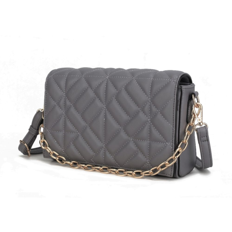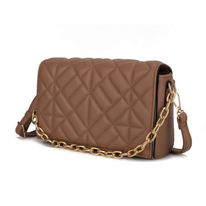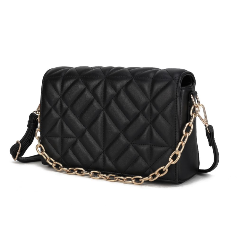 Our Ursula Crossbody Bag combines elegance and ease. Crafted from durable high-quality vegan leather and finished with gold-tone hardware, the Ursula Crossbody Bag has that timeless still modern quilted pattern with a detachable chain-link for styling versatility and instantly add a tough-luxe finish to your look. With magnetic snaps flap, unzips to reveal a spacious interior to fit your belongings. It features a wall zippered pocket inside and a convenient slip back pocket.