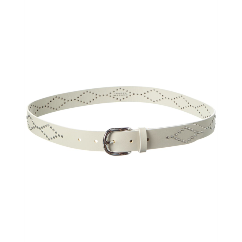 Elevate your outfit with the Isabel Marant Liliana Leather Belt. Crafted in Italy, this chic belt features silver-tone hardware, stud embellishments, and a pin buckle closure for a touch of edgy sophistication. The chalk color adds a versatile element to your wardrobe, while the 1.2 inch width adds a statement finish to any look. Please note that sizing is in centimeters, so be sure to refer to the size chart for US conversions. Rest assured, all our products are 100% genuine, sourced from trusted independent suppliers to ensure authenticity. Make a stylish statement with the Isabel Marant Liliana Leather Belt.