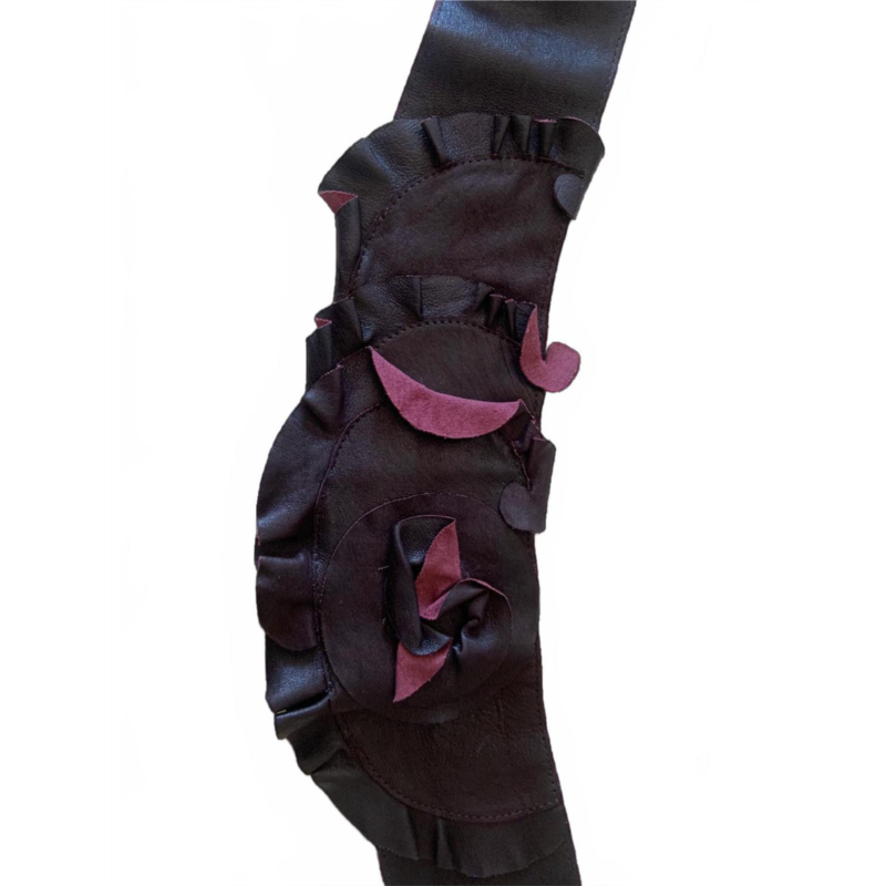 The perfect belt can really tie an outfit together and this one is no exception. Classic in its design and built to last, this belt can complement any outfit.Stunning piece that embodies both versatility and sustainability. Crafted in luxurious leather with a unique sculptural cut. Features a distinctive two-tone finish in burgdy and patent black. Its adjustable contour design ensures a perfect fit while adding a touch of elegance with its Burgdy Rosette detail.
