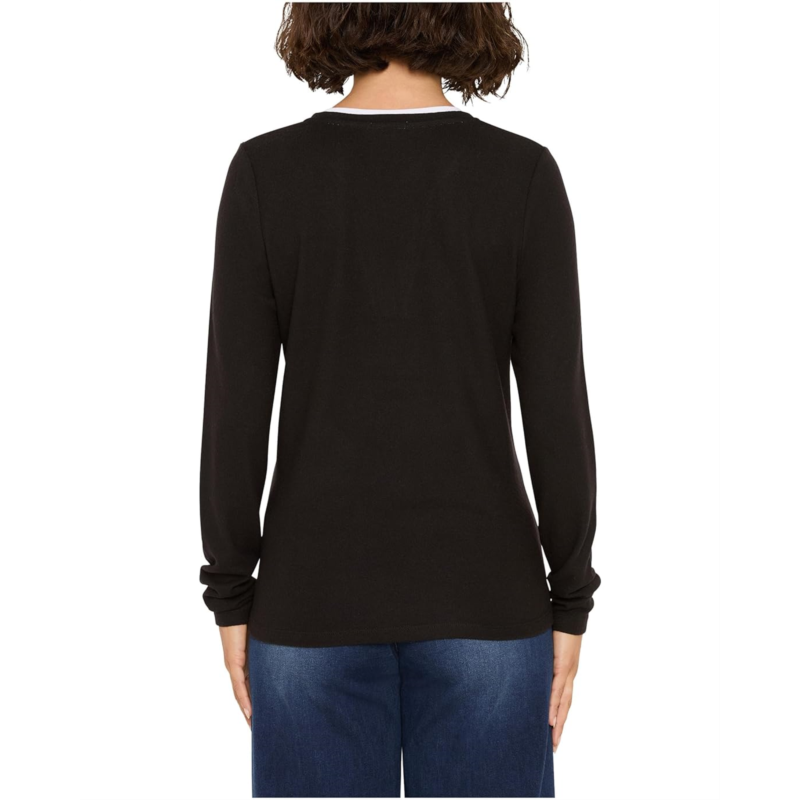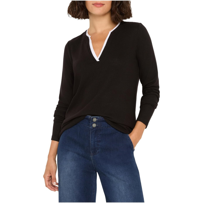 - A layered look with less effort. This two-fer top features placed interior jersey to create the illusion of an underlayer while also creating chic color contrast: an easy way to mix up your everyday top. Featuring a dramatic split neck with the slight overlap at the base of the V. Wear it with denim or a clean trouser.