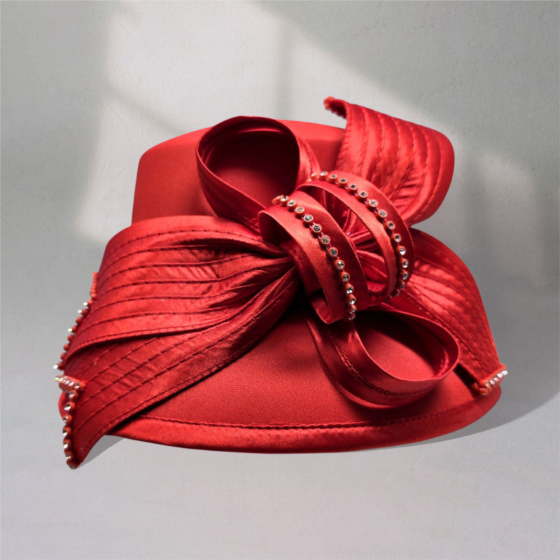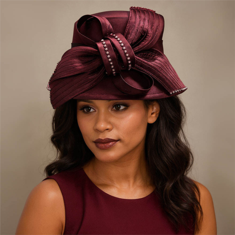 Crown Circumference - 23Crown Height - 4Brim Height - 3Material - 100% PolyesterMake a refined statement with this elegant formal hat, designed with a sculpted bow and sparkling rhinestone trim. Perfect for weddings, church services, and upscale occasions, this sophisticated accessory combines timeless style with graceful detailing.