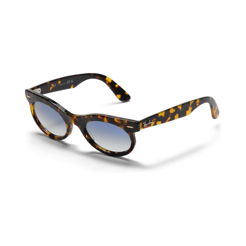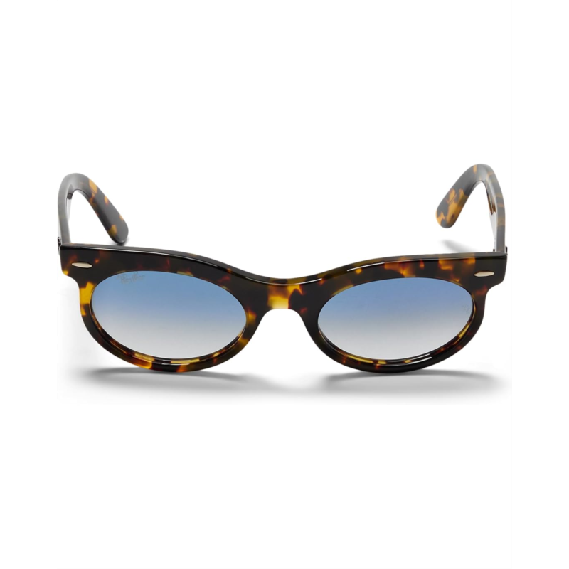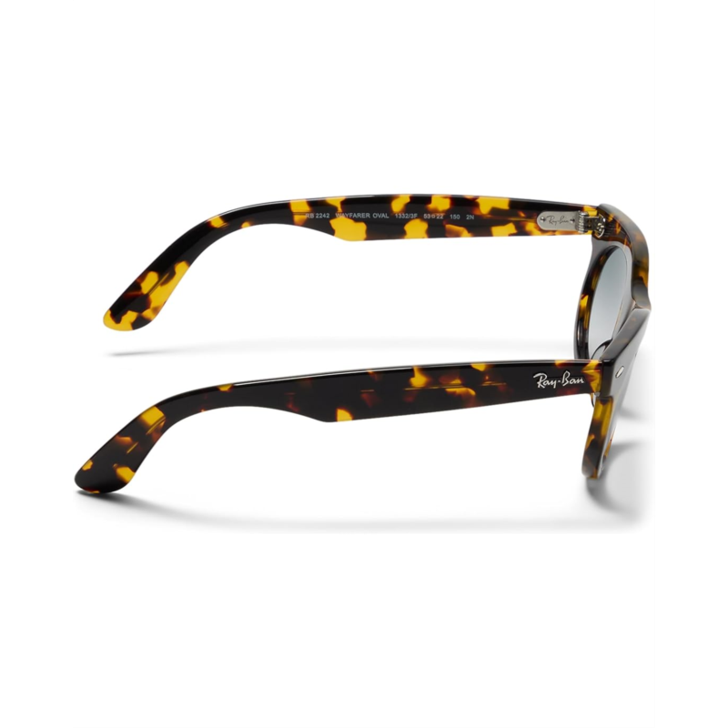 - Look smart and stylish wearing Ray-Ban 0RB2242 Wayfarer Oval Sunglasses, featuring an oval, yellow havana frame with clear/blue gradient lenses and classic metal front rivets. The sunglasses combine bold aesthetic and a narrower lens shape, plus the UV protection lens coating keeps you protected from harmful sunrays.