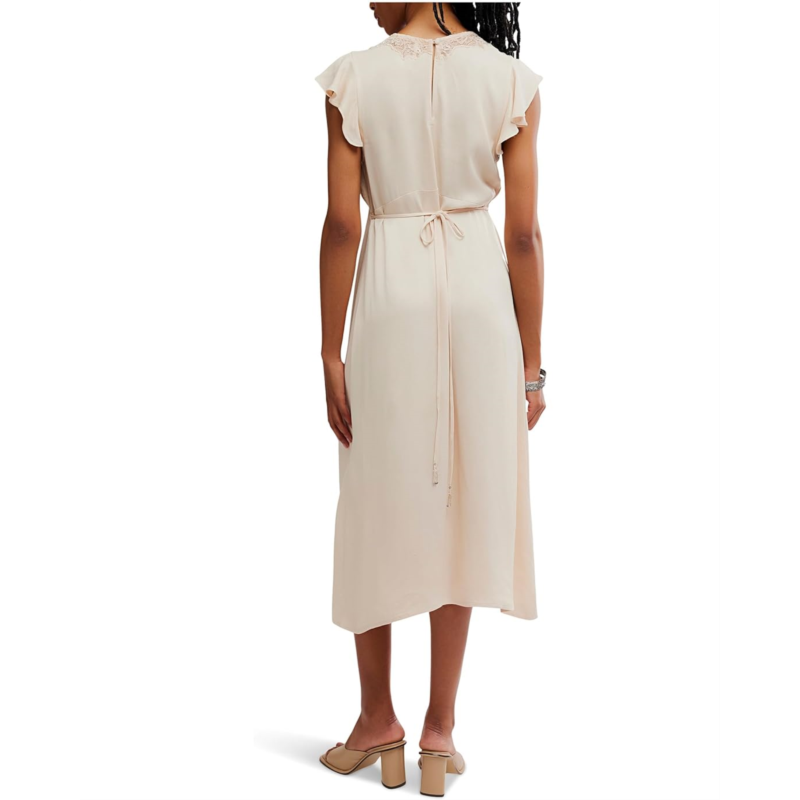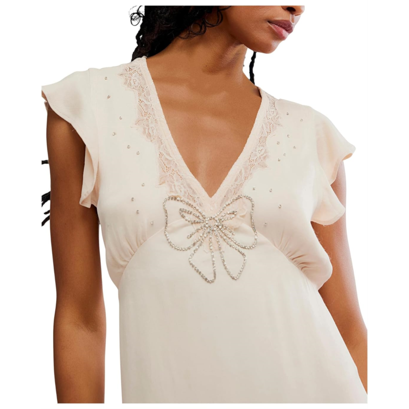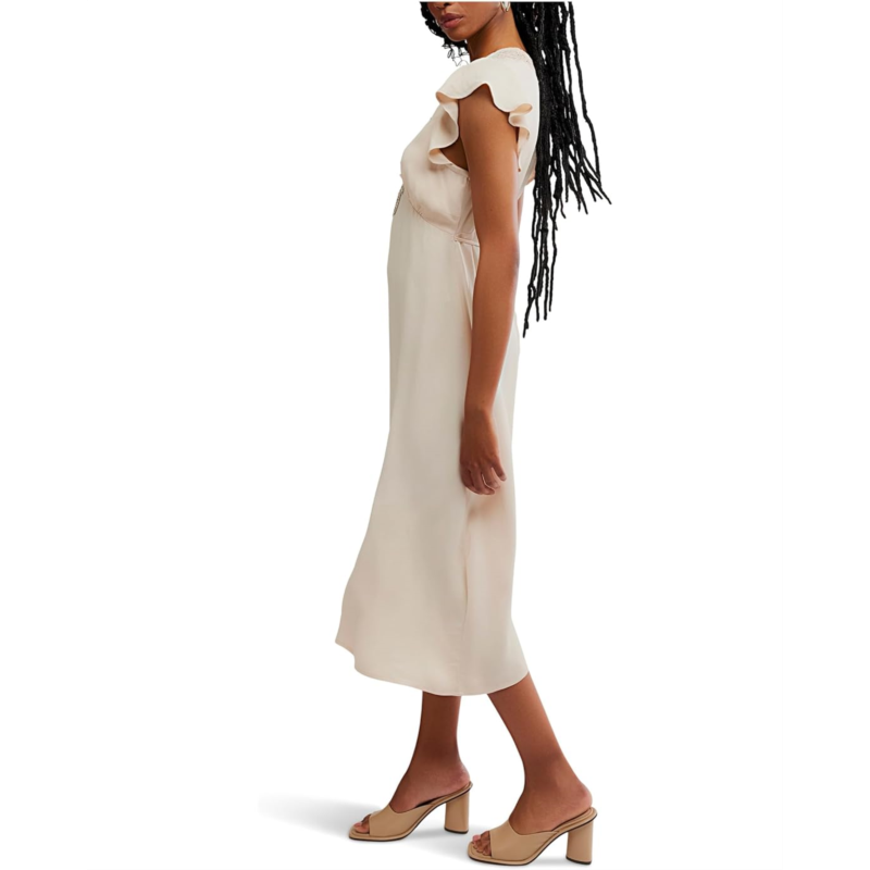 - The Free People Tied With Joy Midi is your go-to statement piece for effortless sophistication and feminine allure. Crafted in a luxurious satiny fabric that drapes beautifully, this dress features a flattering V-neckline adorned with a delicate embellished bow motif, adding just the right touch of sparkle. The ruffled short sleeves bring a playful yet polished flair, while the empire waist silhouette enhances your natural shape for a timeless, romantic look. Designed in a graceful midi length with a tie-back closure, it offers both comfort and charm in every twirl. Simply pull it on and step out feeling radiant.