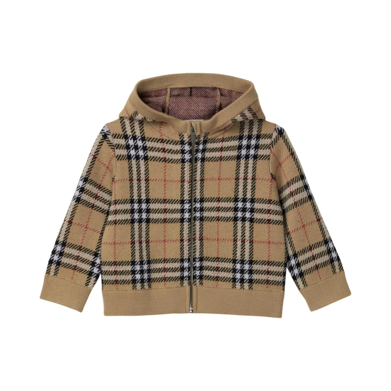 - The Burberry Kids Jimmy Vintage Check Sweater offers an attached hood with a front zipper closure and long sleeves. Also, this sweater has ribbed knit trim and signature Burberry Check.