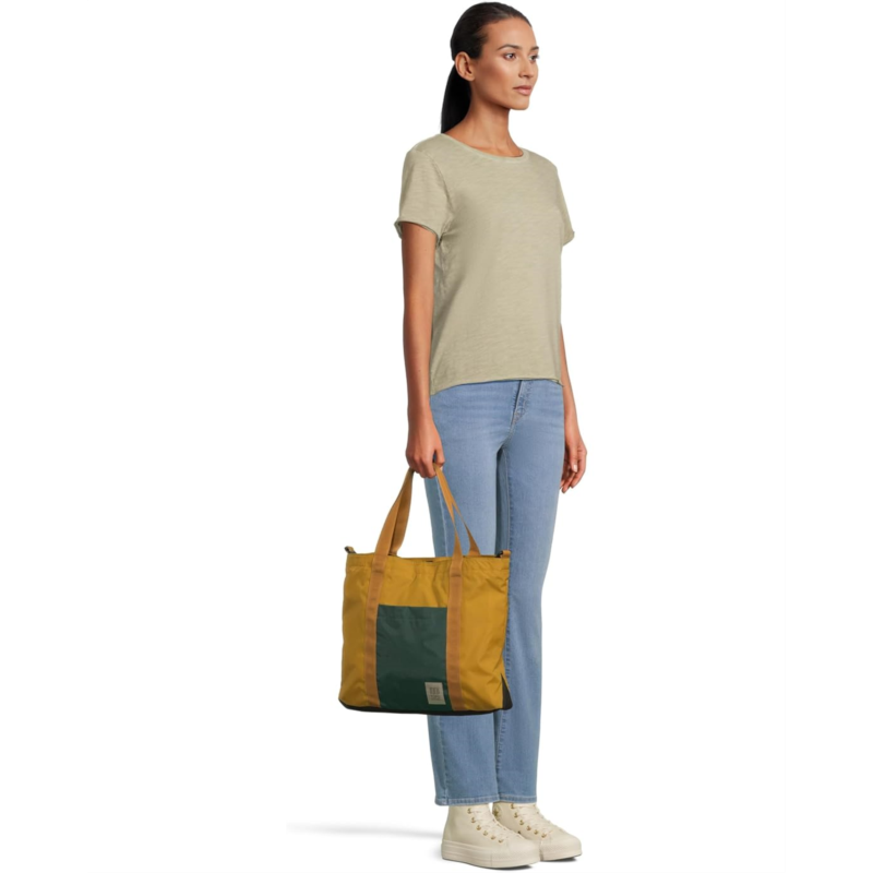 - Carry essentials effortlessly in the Topo Designs Mountain Essential Tote. It is crafted with 200D recycled nylon lightweight ripstop, 400D recycled nylon, and PFC-free DWR fabric. The small version, with an internal top entry pocket, key hook, and external top entry pocket allows hassle-free storage. The two shoulder straps and removable long shoulder strap allow easy carrying on the go, while the loop & toggle top closure keeps things stored securely.