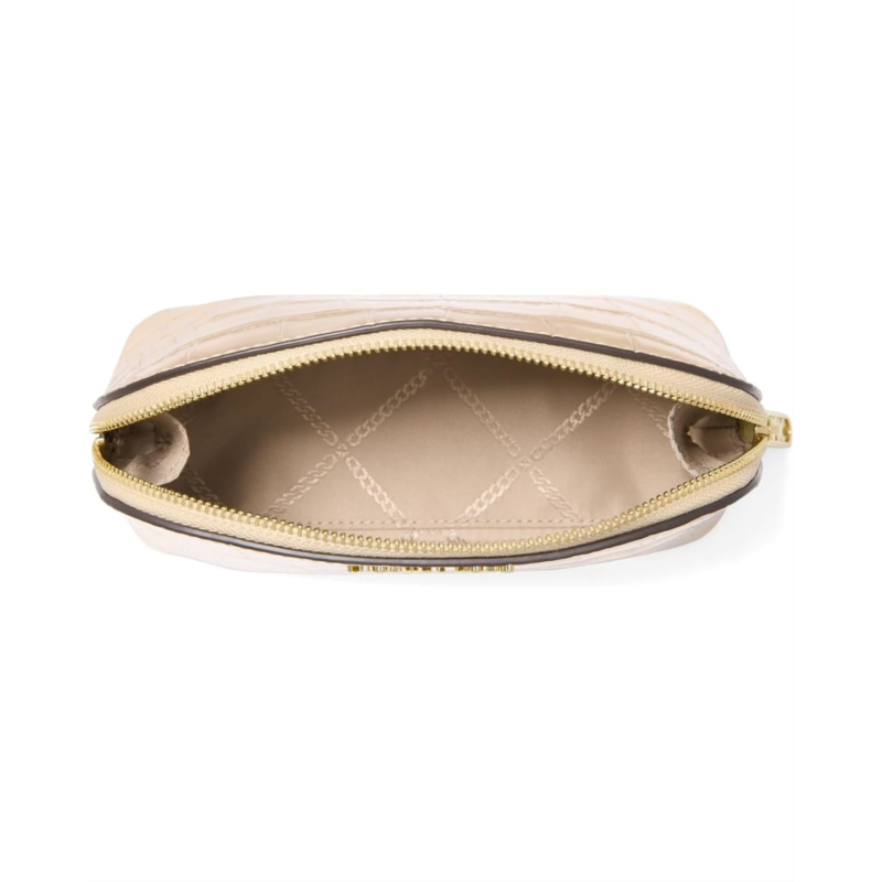- Shine on-the-go carrying the MICHAEL Michael Kors Empire Small Travel Pouch - your sleek companion for effortless style and organization. Crafted from soft metallic croco-embossed leather, this chic pouch is a glamorous way to carry your essentials. Its zippered closure keeps your items secure, while the dedicated credit card compartment adds convenience to your daily routine. Compact yet spacious enough to hold cosmetics or other necessities, this pouch is perfect for travel or everyday use.