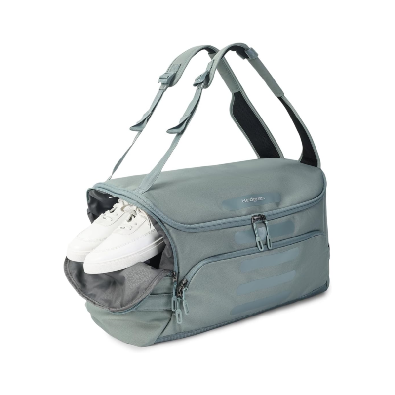 - Meet your travel MVP: The Hedgren Sojourn Duffle. Crafted from durable polyester with a lightweight feel, this all-in-one wonder transforms effortlessly from a backpack to a duffle, offering total flexibility on the go. The spacious main compartment stores bulkier items with ease, while four thoughtfully placed pockets, including an RFID-blocking zippered pocket, keep essentials organized and secure. A separate shoe/laundry pocket with exterior access keeps things clean and convenient. Plus, the smart sleeve slips over your suitcase handle for seamless airport navigation. When not in use, simply roll it up and stow it away.