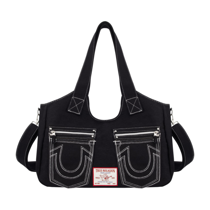 Keep your belongings safe and secure with this cute and stylish reusable travel tote bag. Decorated with eye-catching silver hardware, this small beach tote bag a spacious main compartment with a front slip pocket to store your belongings, and a magnetic snap closure to keep your valuables secure inside. These tote bag purses feature top carrying handles with a 5 inch drop, and a convenient removable shoulder strap which can be adjusted from 19 to 29 inches for easy travelling. This tote shoulder bag measures 18 H x 7 W x 4 D in inches.-This summer purse is an officially licensed True Religion product, ensuring you are receiving genuine and authentic travel totes-Removable, Adjustable shoulder strap drop 19''-29''-5'' handle drop-Silver Hardware-Magnetic snap closure-True Religion Signature polyester lining-Exterior - Front Slip pocket -Material Shell - 50% polyester, 50% cotton. Lining - 100% polyester-Dimension - 8H X 7W X 4D