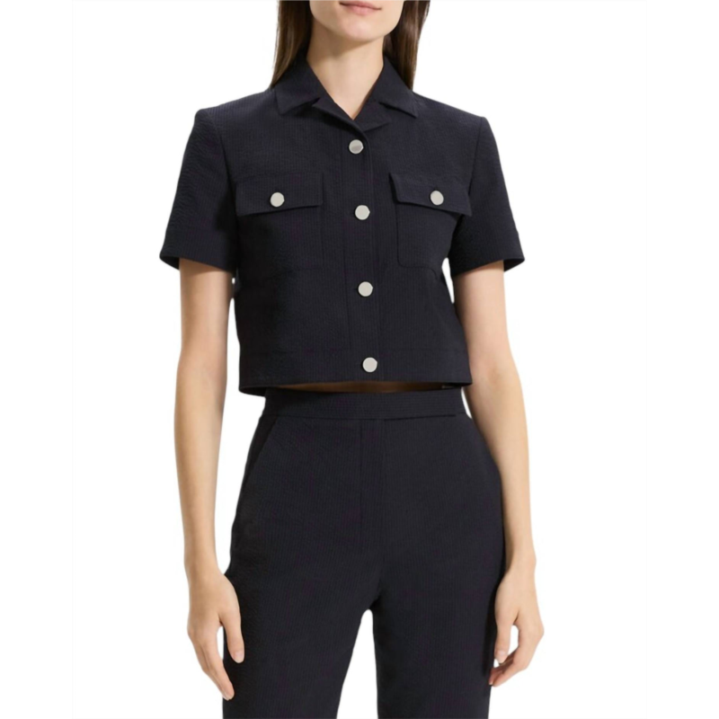 A jacket so versatile you can literally wear it with anything.Elevate your evening look with the Theory Seersucker Cropped Short Sleeve Jacket in navy, a chic addition that captures 90s fashion effortlessly. Made from a cotton blend, this seersucker jacket is designed with short sleeves and a notched collar for a sophisticated silhouette. With a cropped length of approximately 16.8 inches from shoulder to hem, it features flap patch pockets for added charm. Imported and featuring a button closure, it requires dry cleaning to maintain its textured elegance, perfect for any spring occasion or New Years Eve celebration.