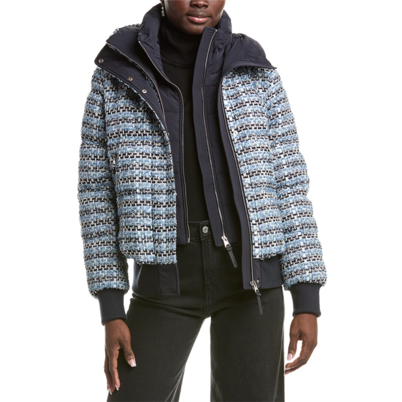 Introducing the Mackage Shirley Tweed Down Coat in Sky Blue Combo, a stunning outerwear piece that combines elevated style with unique functionality. This coat features a removable bib and an adjustable storm visor, stand collar, drawcord-toggle hood, rib-knit cuffs and hem, front zip pockets, and an interior welt pocket. Measuring approximately 29 inches from shoulder to hem, this coat is designed to keep you warm and stylish all season long. The front zipper closure adds a modern touch, while the mix of materials including cotton, polyester, nylon, metallic fibers, and rayon ensures both comfort and durability. The bib is made from 82% recycled nylon and 18% elastane, while the down filling is composed of 90% duck down and 10% feathers. To care for this coat, simply dry clean only. Elevate your winter wardrobe with the Mackage Shirley Tweed Down Coat in Sky Blue Combo. Model is 510 and is wearing a size small. Please note that measurements may vary slightly by size.