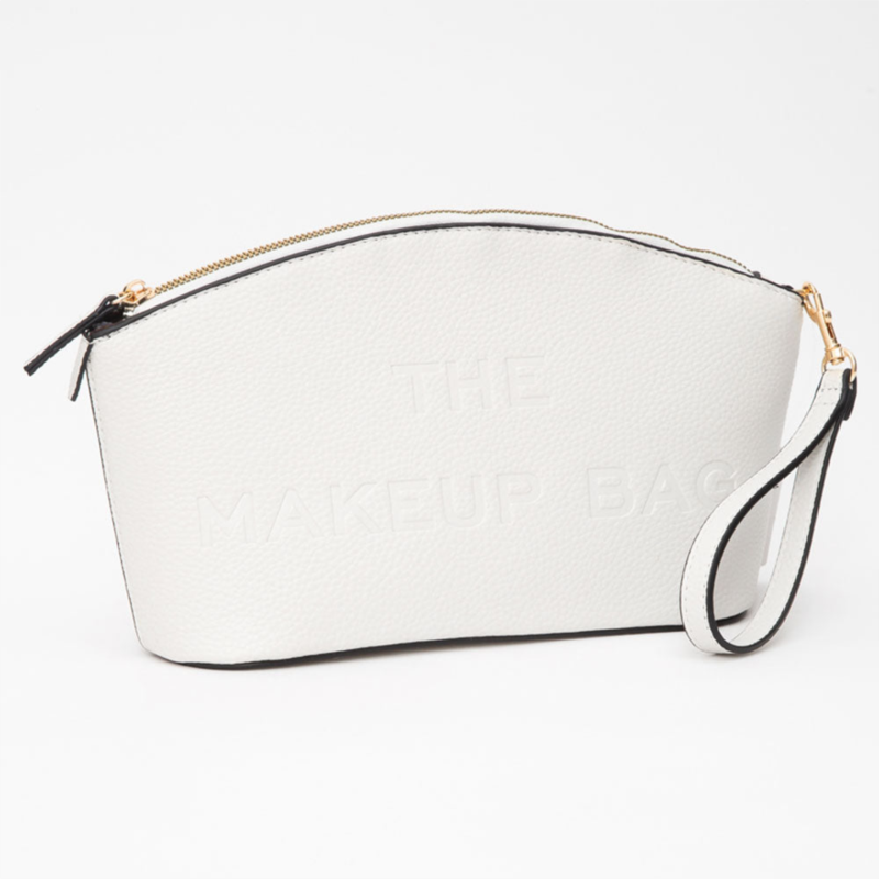 Size - 10'' X 6.25'' X 3''Zipper ClosureStrap Size - 7.5'' L / DetachableStay organized in style with this vibrant colored makeup bag featuring embossed “THE MAKEUP BAG” text, a secure zip closure, and a convenient wrist strap. Made of durable faux leather ? perfect for travel or everyday use.