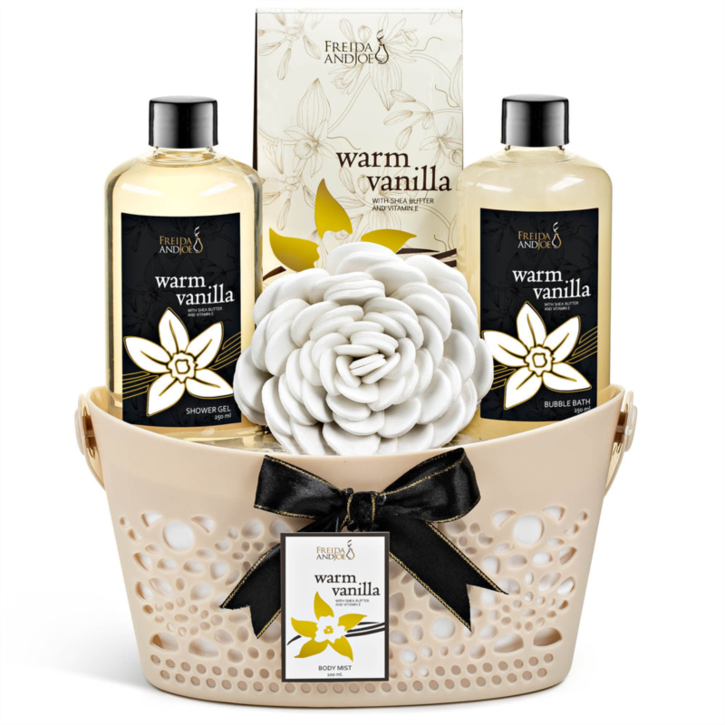 Transform your bathroom into a serene spa retreat with the Freida and Joe Aromatherapy Delight Lavish Warm Vanilla Spa Bath and Body Gift Basket. Treat yourself or someone special to a moment of relaxation and indulgence with this exquisite spa kit.