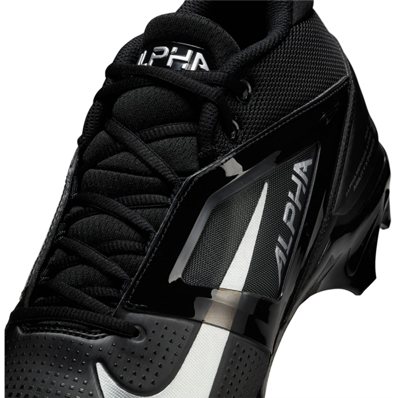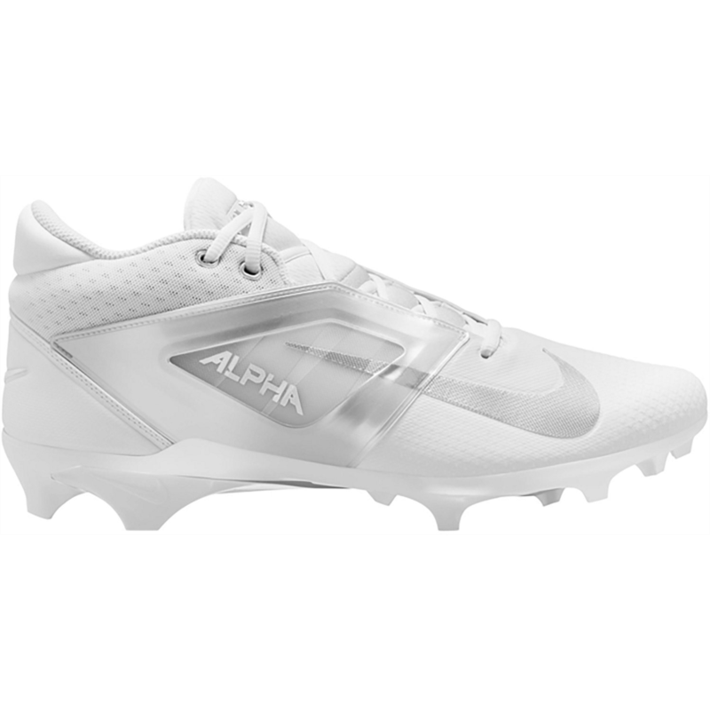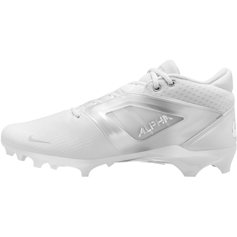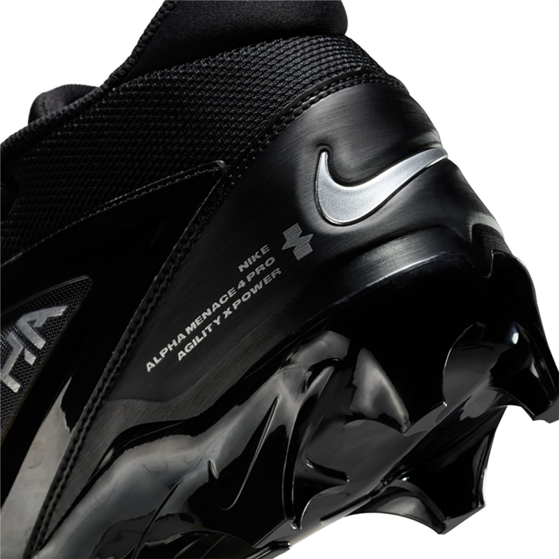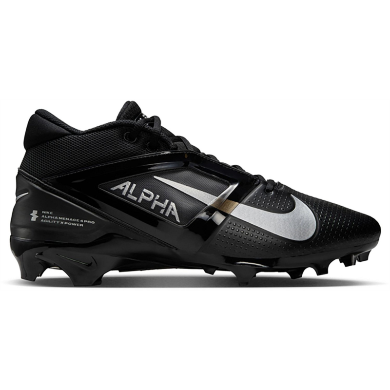 Put the moves on the competition with the Nike Mens Alpha Menace 4 Pro Football Cleats. The molded plastic quarter cages in the uppers provide stability, while the wide stud placement with edge traction enables sharp cuts and lateral stability. The carbon fiber plates add stiffness to the heels, stability to the midfoot and response to the forefoot, and the X-Frame on the bottoms deliver additional stability during hard braking and quick cuts. Molded plastic quarter cages in the uppers provide stability