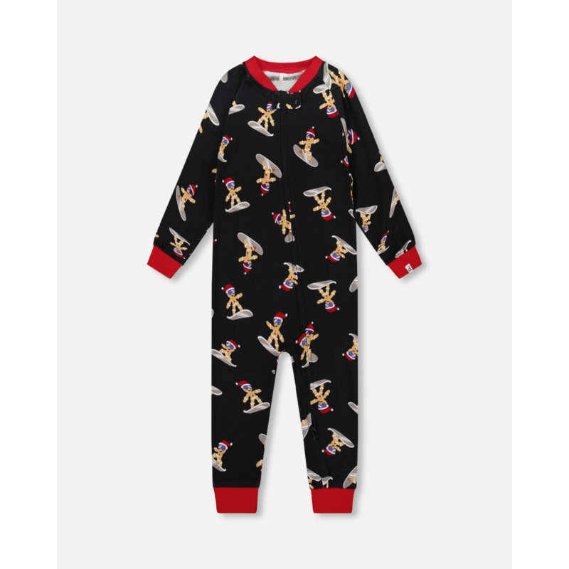 A snowboarding gingerbread man print makes this sleepwear set a perfect choice for the holiday season. With its bold allover cookie print and an asymmetrical closure, this long sleeve one-piece pajama is made from ultra-soft organic cotton interlock that makes it feel like a dream against the skin. Contrast trim at the neck and cuffs add a bold pop of color!