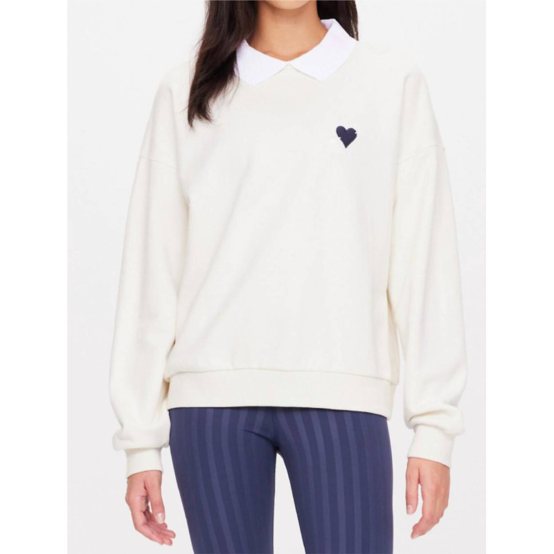 Cooler temps call for layering and we love this adorable sweatshirt for all the obvious reasons.Meet the Pascal Collared Crew by THE UPSIDE in a sophisticated shade of Creme, expertly blending old school sportiness with a preppy twist. This women''s sweatshirt features long sleeves and a logo at the chest and a discreet arrow logo pip at the cuff. Care for this graphic piece is straightforward with machine wash instructions and line dry. Enjoy the ease of a pull-on closure without any pockets.