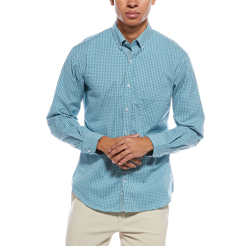 Introducing the TailorByrd Signature Gingham Shirt, a classic menswear piece with a colorful twist. This teal shirt features a button-down collar, left chest pocket, and a shirttail hem for a polished yet casual look. Made from 97% cotton and 3% elastane, this shirt is both comfortable and stylish. The model is 61 and is wearing a size medium, but measurements may vary slightly by size. Perfect for any occasion, this shirt is machine washable and imported for your convenience. Upgrade your wardrobe with the TailorByrd Signature Gingham Shirt today.