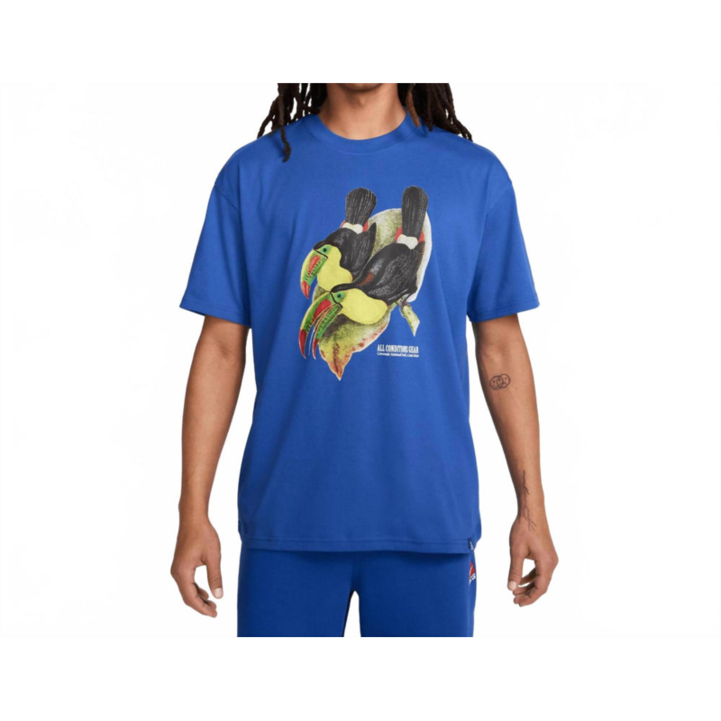 Introducing the Mens ACG Toucan Dri-FIT Top by NIKE, a standout piece in Game Royal blue designed for streetwear style. This short sleeve tee features sweat-wicking Dri-FIT technology and colorful toucan graphics inspired by Costa Rican wildlife. With a composition of 63% polyester and 37% cotton, this imported top offers a roomier fit for ease of movement and layering. Closure - Pull-on style. Care - Machine washable for convenience.
