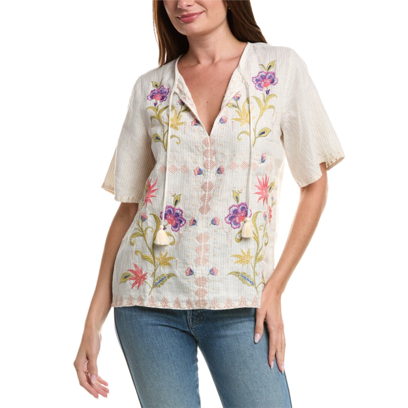 Introducing the stylish and unique Johnny Was Ruffle Sleeve Field Linen Blouse! This beautiful blouse exudes eclectic, boho vibes with a vintage flare, making it a perfect addition to any fashion-forward womans wardrobe. The blouse features stunning embroidered detailing on an Exordia stripe pattern, adding a touch of sophistication to its relaxed silhouette. Made from 100% linen with polyester trim, this blouse is not only fashionable but also comfortable to wear. With a length of approximately 25 inches from shoulder to hem, this blouse is perfect for day or night looks. For best care, dry clean only. Imported from Johnny Was, a brand known for its high-quality, trendy pieces. Elevate your style with the Johnny Was Ruffle Sleeve Field Linen Blouse today!