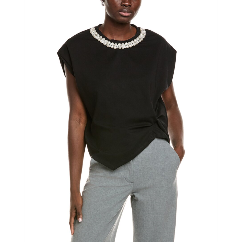 Introducing the Gracia Twist Knot Top, a stunning addition to your wardrobe. This black top features a sophisticated twist knot design with a pearl bead neckline, adding a touch of elegance to your outfit. Made from a blend of rayon, nylon, and spandex, this top is both comfortable and stylish. Pair it with your favorite bottoms for a chic look. Hand wash recommended. Imported. Shop now and elevate your wardrobe with this uniquely inventive and modern design from Gracia.