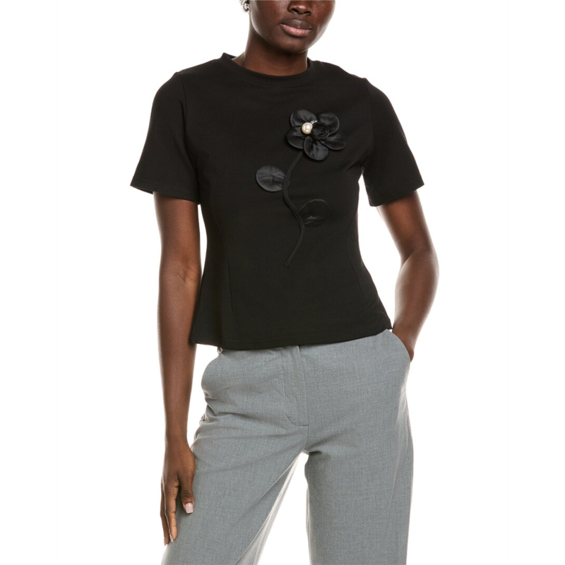 Introducing the Gracia Flower Applique T-Shirt, a stylish addition to your wardrobe that combines modern design with feminine flair. This black t-shirt features intricate flower appliques for a touch of whimsy. Made from a blend of rayon, nylon, and spandex, this top is both comfortable and figure-flattering. Measuring approximately 20 inches from shoulder to hem, this versatile piece can easily be dressed up or down for any occasion. Hand washable and imported, this t-shirt is a must-have for any fashion-forward woman. Discover the uniquely inventive designs of Gracia with this Flower Applique T-Shirt.