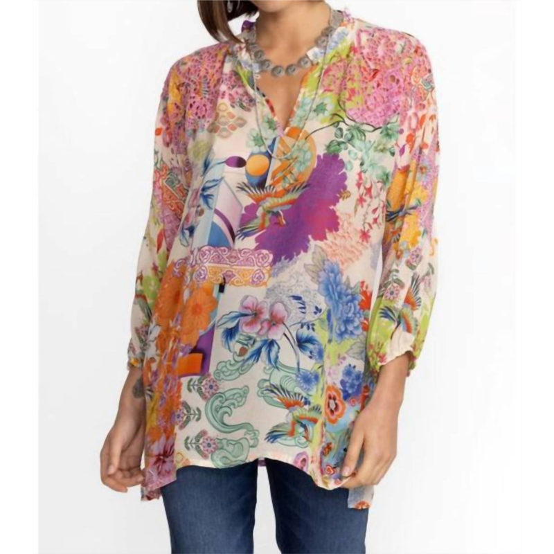 A perfect addition to any wardrobe, this classic tunic style blouse is flattering and effortless. You can easily transition from desk to dinner in this chic top.The Neeka Tunic is made from stretchy, lightweight fabric to combine comfort and style. It features embroidered bishop sleeves, a split V-neck, and bright, lively colors and patterns. Machine Wash.