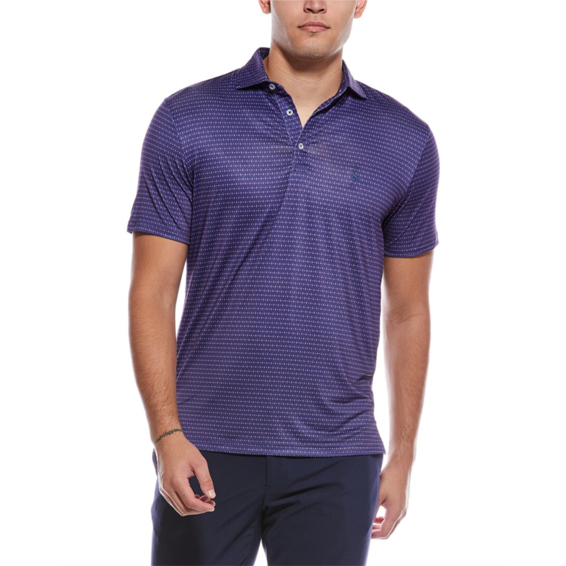Elevate your casual wardrobe with the TailorByrd Dots & Diamonds Performance Polo Shirt. Crafted from moisture-wicking fabric in a sleek navy hue, this polo shirt features a classic spread collar, logo embroidery, and side slits at the hem for added mobility. The button placket adds a touch of sophistication, while the blend of polyester and spandex ensures comfort and durability. Ideal for everyday wear or sporty activities, this polo shirt is a versatile addition to any mans closet. Machine washable and imported, this shirt is easy to care for and style. Be prepared to stand out in style with TailorByrds classic menswear aesthetic with a colorful twist.