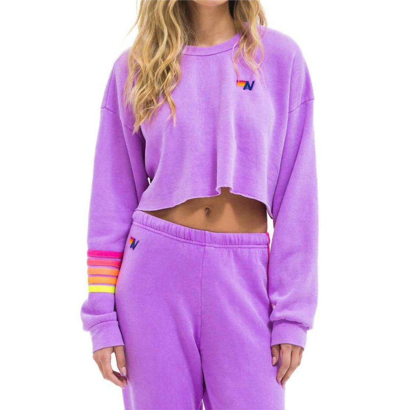 AVIATOR NATION rugby stitch cropped crew sweatshirt in neon purple/ neon