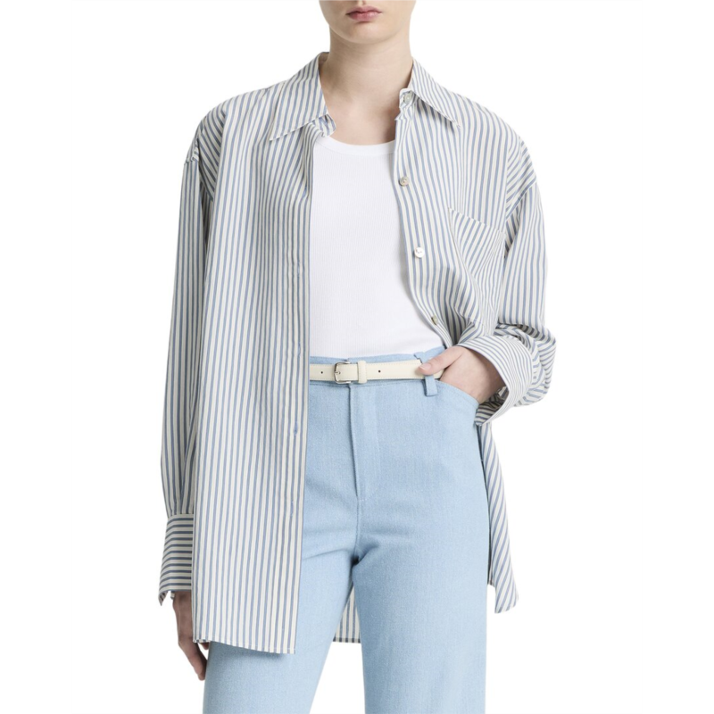 Elevate your casual chic style with the Vince Furrow Stripe Button Down Shirt. This classic piece features a stylish blue and off-white stripe pattern that adds a touch of sophistication to your look. The shirt is made from a luxurious blend of 89% viscose and 11% nylon, ensuring both comfort and durability. Designed with simplicity and laid-back vibes in mind, this Italian-made shirt is a versatile and timeless wardrobe essential. Pair it with your favorite jeans for a relaxed yet polished look. Shop the Vince Furrow Stripe Button Down Shirt and embody the effortless elegance of California style.