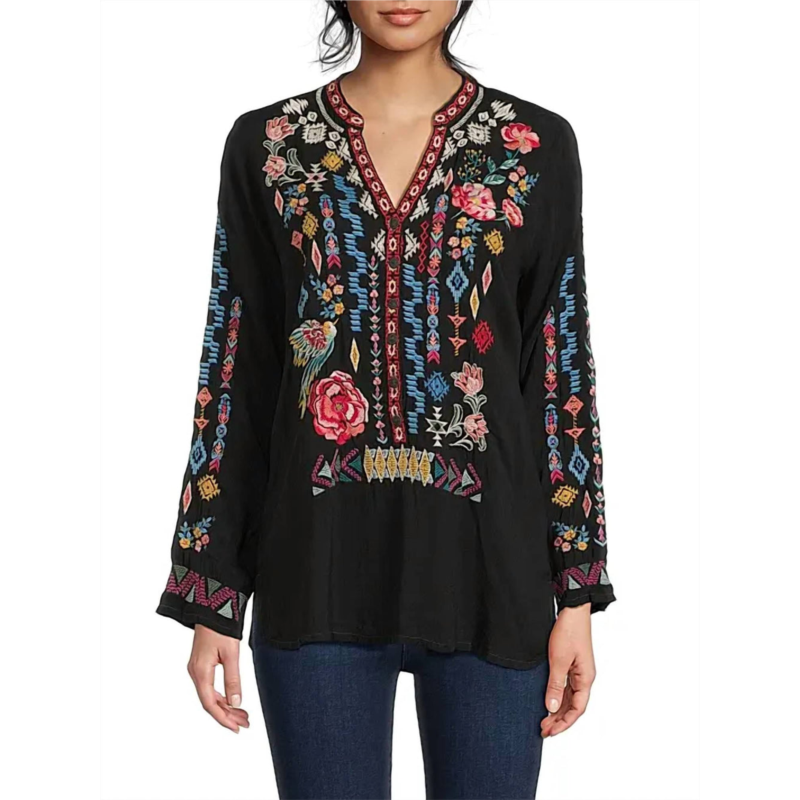 Discover the versatile charm of this tunic blouse, designed with both layering and standalone wear in mind. Its flattering silhouette and stylish details make it a closet essential.Introducing the Johnny Was Margot Blouse in a vibrant Sarah color scheme, perfect for adding a splash of personality to your wardrobe. This long sleeve tunic is patterned with bold, embroidered details and crafted from 100% Cupro, offering a lightweight and comfortable fit. It features a split V-neckline and side slits with a button closure for a casual, relaxed vibe. Care for this piece with a machine wash in cold water, and dry it on low heat. Measurements for size Medium include a bust of 46 inches and a front length of 27 inches.