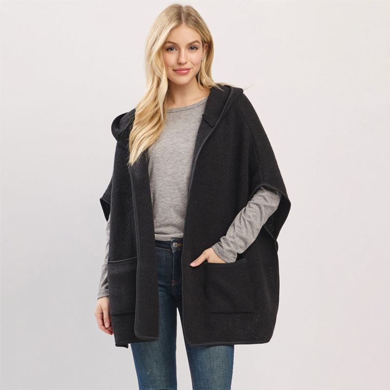 [US] TRUEDAMES solid hooded poncho wrap with pockets