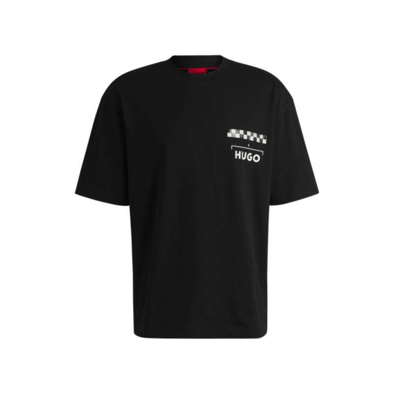 Printed with racing-themed artwork, this HUGO Menswear T-shirt is great for refreshing a casual collection. Comfortable boxy fit. Soft cotton jersey.