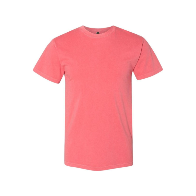 5.4 oz./yd, 100% combed ring-spun cotton, 24 single. 1x1 baby rib set-in collar with front coverstitch. Twill tape at back neck. Side seams. Tear away label. Due to the unique pigment dying process we suggest the following - Use methods and inks specific to avoiding dye migration When applying white ink, use a gray plastisol blocker under base, flash then poly white.
