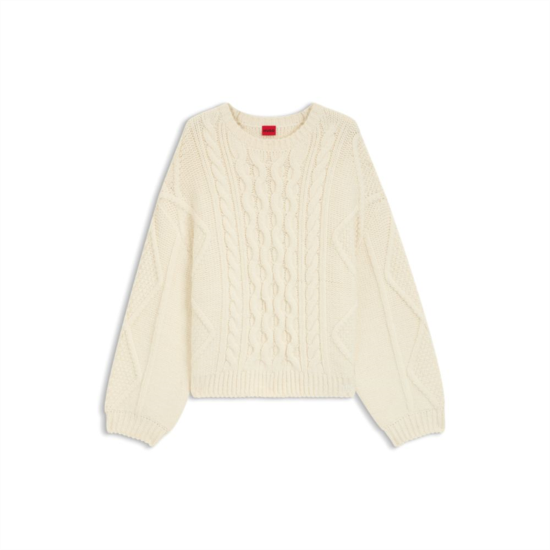 Layer up in style with the mixed cable knit of this oversize HUGO Womenswear sweater. Blended with alpaca and wool. Embroidered stacked logo.