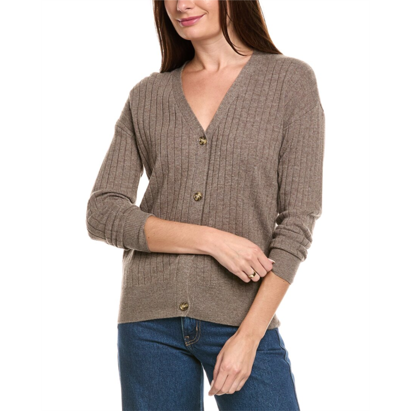 Elevate your fall wardrobe with the Kier + J Ribbed V-Neck Wool & Cashmere-Blend Cardigan. This cozy and luxurious cardigan is crafted from a blend of 90% wool and 10% cashmere, ensuring both warmth and softness. The classic brown color and ribbed texture add a touch of sophistication to any outfit. The cardigan features dropped shoulders and a button front closure for a relaxed yet polished look. With a length of approximately 26 inches from shoulder to hem, this versatile piece can be dressed up or down. Model is 5''10.5 and is wearing a size small. Dry clean only. Imported. About The Brand - Cozy Cashmere And More.