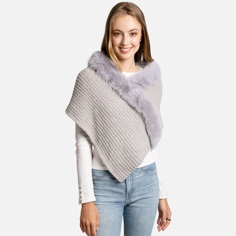 Size - One SizeMaterial - 100% Poly. MicrofiberChic knitted shawl with soft faux fur trim, designed for warmth and sophistication. This versatile wrap drapes beautifully over any outfit, making it a perfect accessory for casual wear or evening elegance.