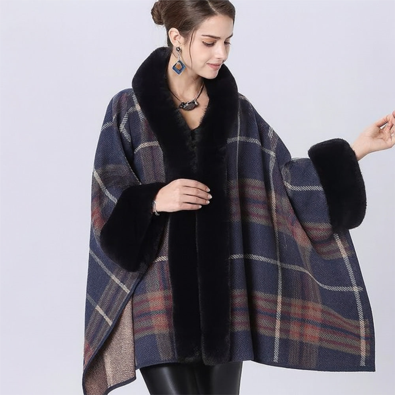 Size - 43 X 36Material - 100% AcrylicStay chic and cozy with this plaid cape coat featuring soft faux fur trim on the collar and cuffs. A stylish outerwear piece perfect for layering, evening outings, or elevating everyday looks with timeless sophistication.