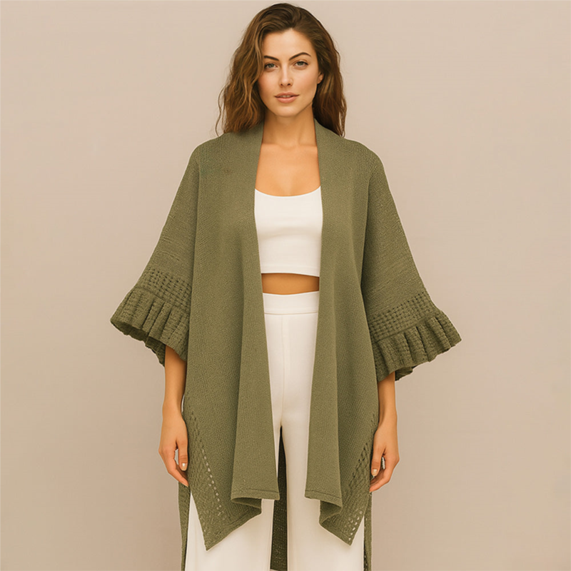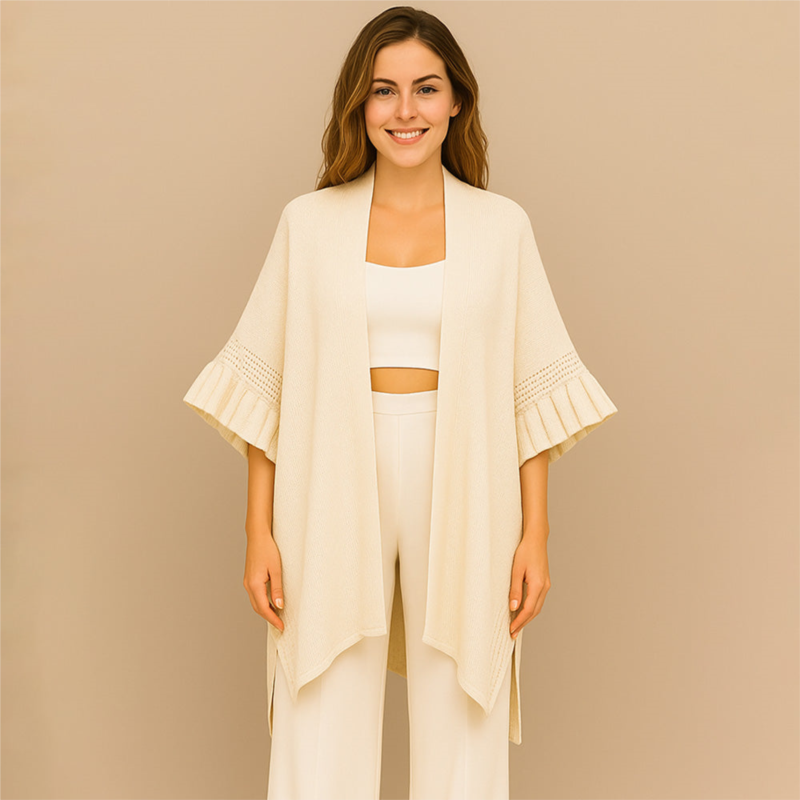 TRUEDAMES solid knit open front punched ruffle sleeves kimono poncho