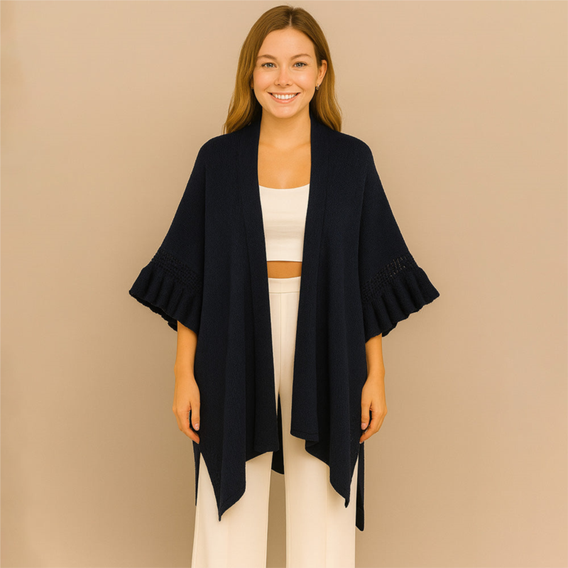 [US] TRUEDAMES solid knit open front punched ruffle sleeves kimono poncho